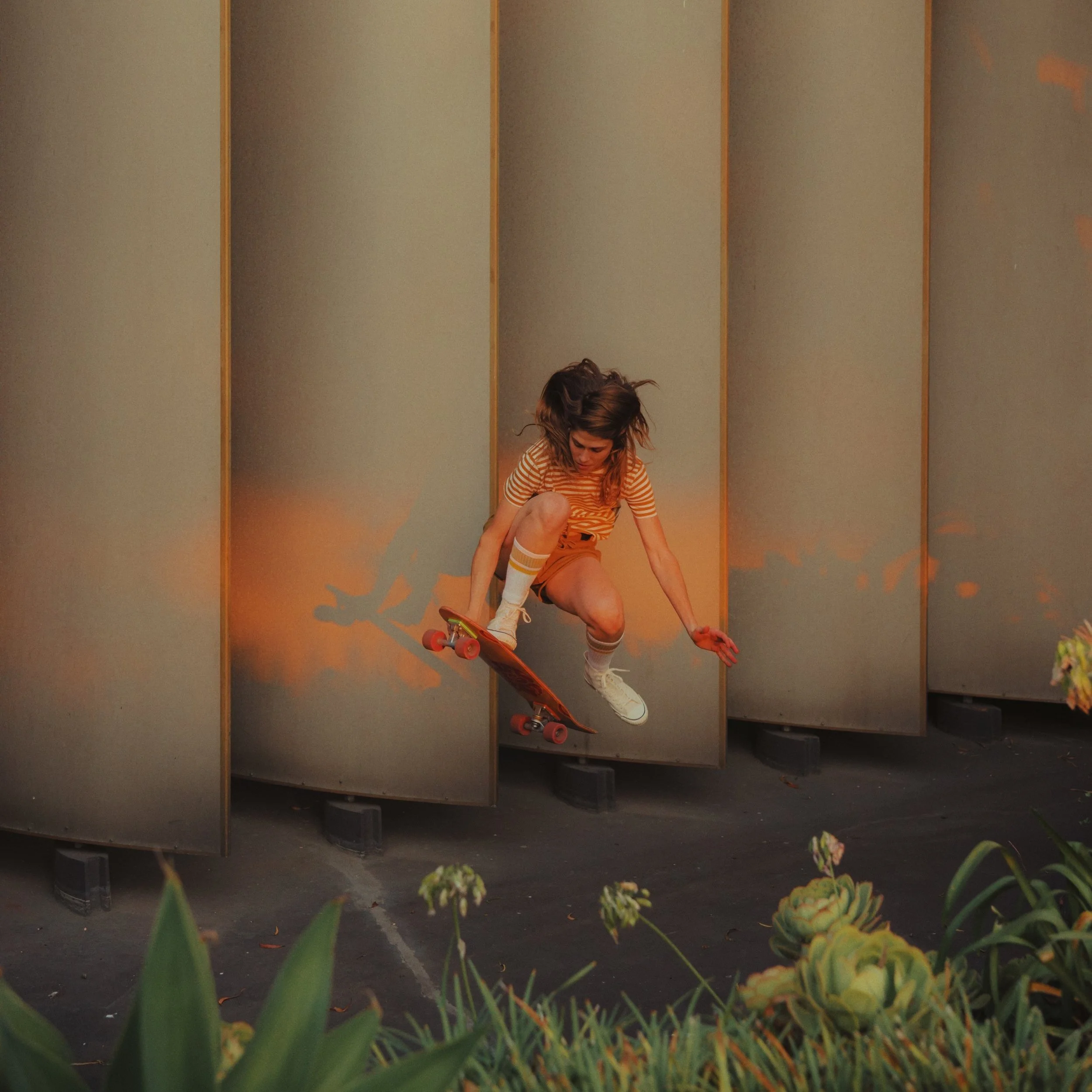 In Franck Bohbot's series of photographs featuring skateboarder Sierra Prescott, we are treated to warm and cinematic images that showcase the unique relationship between skateboarding and architecture. Through these photographs, Bohbot takes us on a journey through his neighborhood, showcasing some of its most iconic locations and structures. One of the most striking images in the series features Prescott skateboarding next to the Richard Neutra VDL house. The juxtaposition of the sleek, modernist architecture with the raw energy and athleticism of the skateboarder creates a beautiful and powerful visual contrast. The dreamy, warm light in the photograph only adds to its cinematic quality, making it feel like a still from a movie. Other images in the series focus on Sunset Boulevard, with its quaint little shops and bustling street life, as well as the Silverlake Reservoir, which provides a beautiful and serene backdrop for Prescott's skateboarding. Through these pictures, we get a sense of the vibrant and diverse community that Bohbot and Prescott call home. Through his lens, we are transported to a world of dreamy light and raw energy, where the urban landscape becomes a playground for athletes and artists alike.